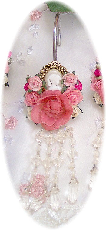 Bring up the 'elegance' level of your bath! Our Cameo Shower Curtain Hooks are made from DESIGNER HEAVY DUTY CHROME PLATED METAL and embellished with beautiful CAMEOS, ROSES AND BEADED TASSELS. Measures: 5" long x 2" wide. (HINT) These also work with regular window curtains as long as the gauge of the rod is no larger than a standard shower curtain rod.